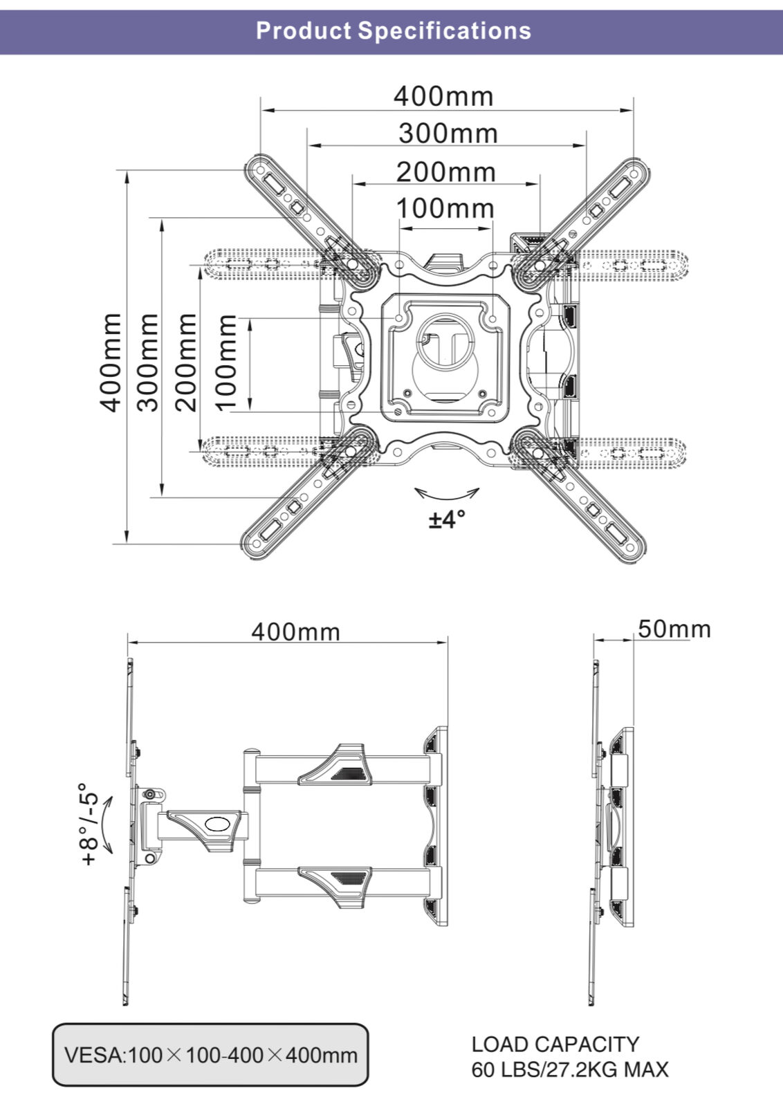 The arm can extend to a maximum of 400mm. Features: