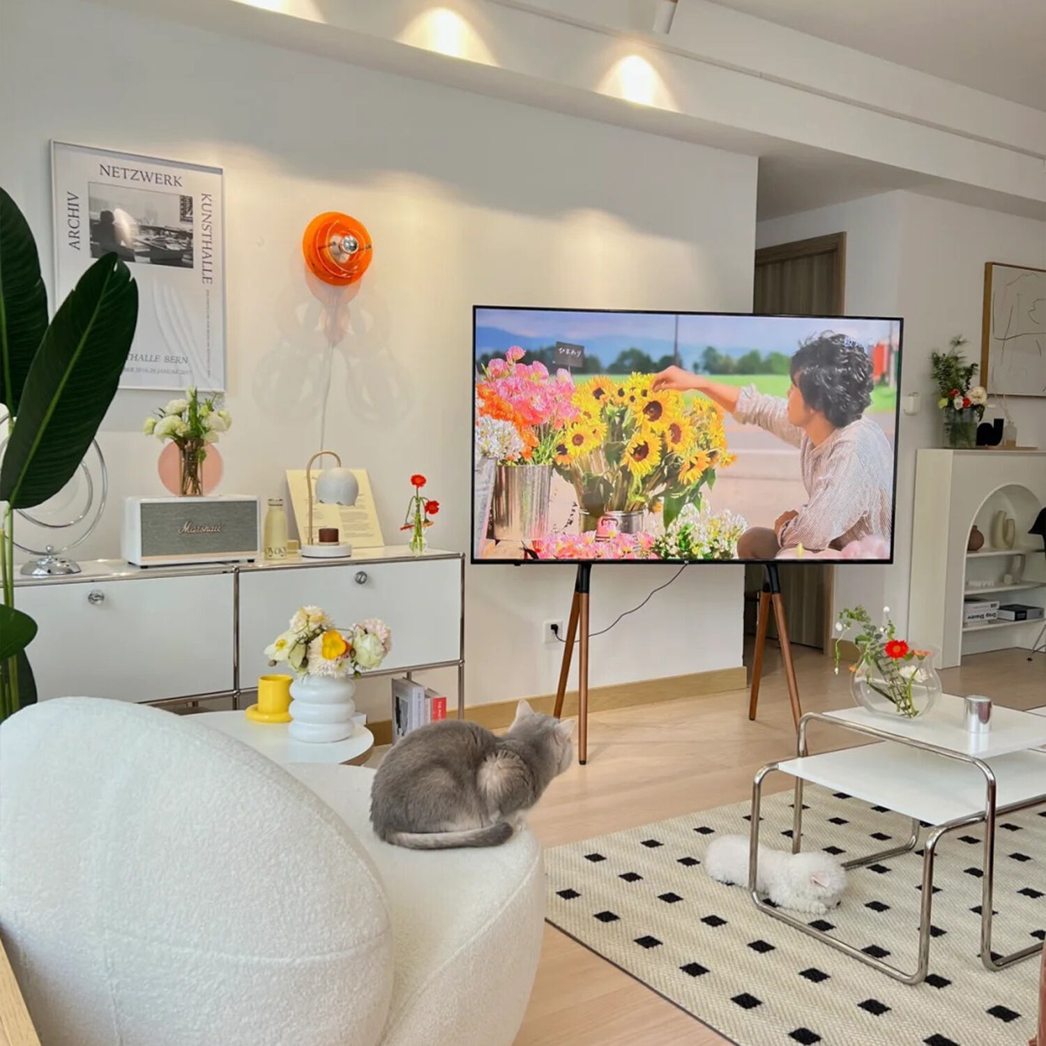 Constructed from high-grade steel, the Aura Pro is built to last. Its patented V-shaped base is not just a design statement but a core element of its rock-solid stability, ensuring your TV remains perfectly secure. The stand effortlessly combines this steadfast foundation with complete mobility. Smooth-rolling, quiet casters allow you to reposition your entertainment center from the living room to the bedroom or home office with ease, while protecting your floors.