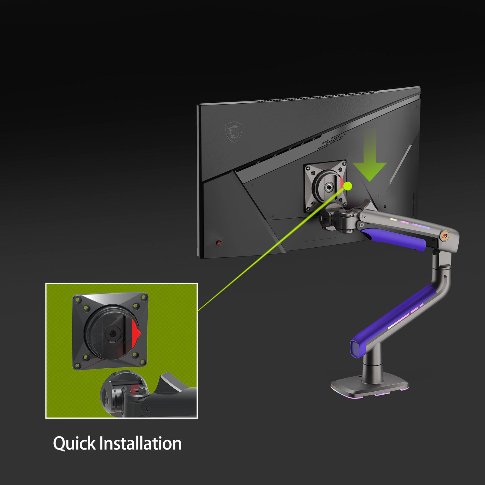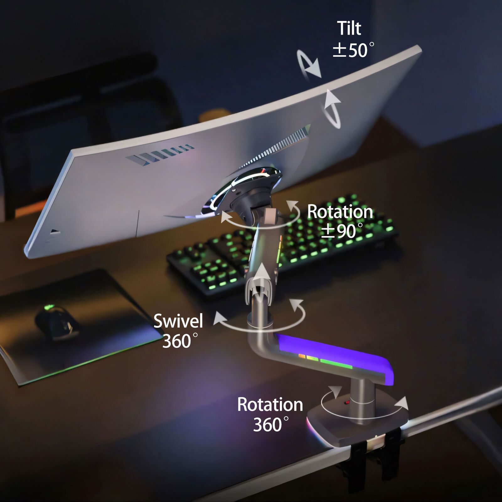 ■ Model:G60Game ■ Weight Capacity: 2-20KG (4.4-44 lbs) ■ Compatible Screen Size: 32-60 inch ■ Tilt Range: +/-50 degree ■ Height Adjustment: 250mm ■ Rotation: 360 degree ■ Swivel: +90 degree ■ VESA Compatibility: 75x75mm, 100x100mm ■ Maximum Arm Extension: 24.8 inch (630mm) ■ Material: Aluminum alloy, cold-rolled steel, plastic ■ Mounting Options: Desk grommet, desk clamp ■ RGB Lighting: Multiple effect modes