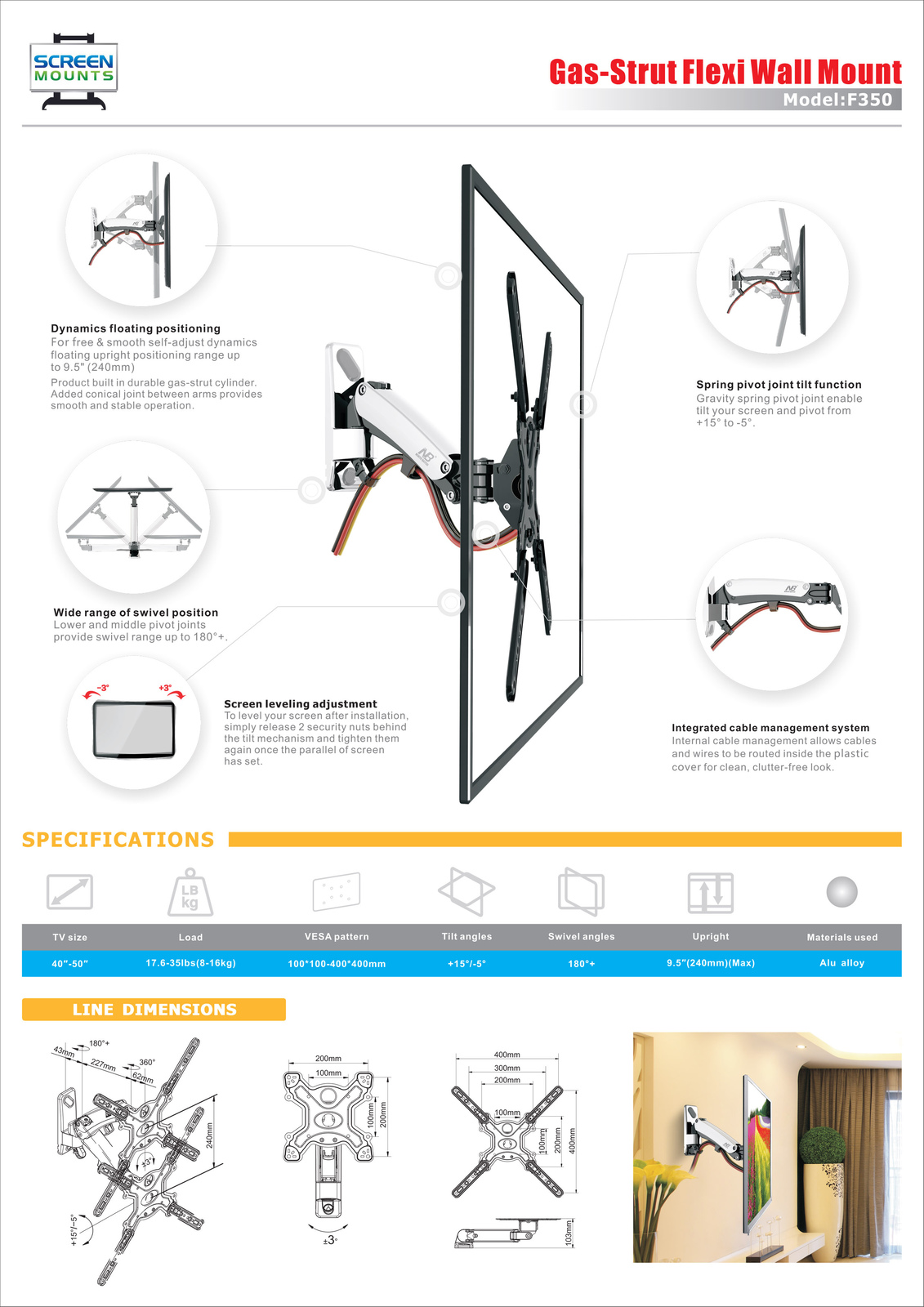 Model: F350 Fits Most 40"- 50" LED, LCD TVs. The F350 gas spring flexi-mount is a full motion LED, LCD TV mount installation. It is designed to enhance your interface viewing and gaming experiences. With a durable Gas-strut cylinder, the screen can be adjusted to your desired angle and height. With a spring pivot joint design, a swivel range of 180° eliminates awkward viewing angles. This full motion wall TV mount allows you to find the optimum viewing angle for entertainment, video conferencing, collaborative work or presentations. The single-arm extension design is is constructed from aluminium alloy materials with a polished chrome finish for aesthetics, and an integrated cable management system for a clean, neat installation. Features: