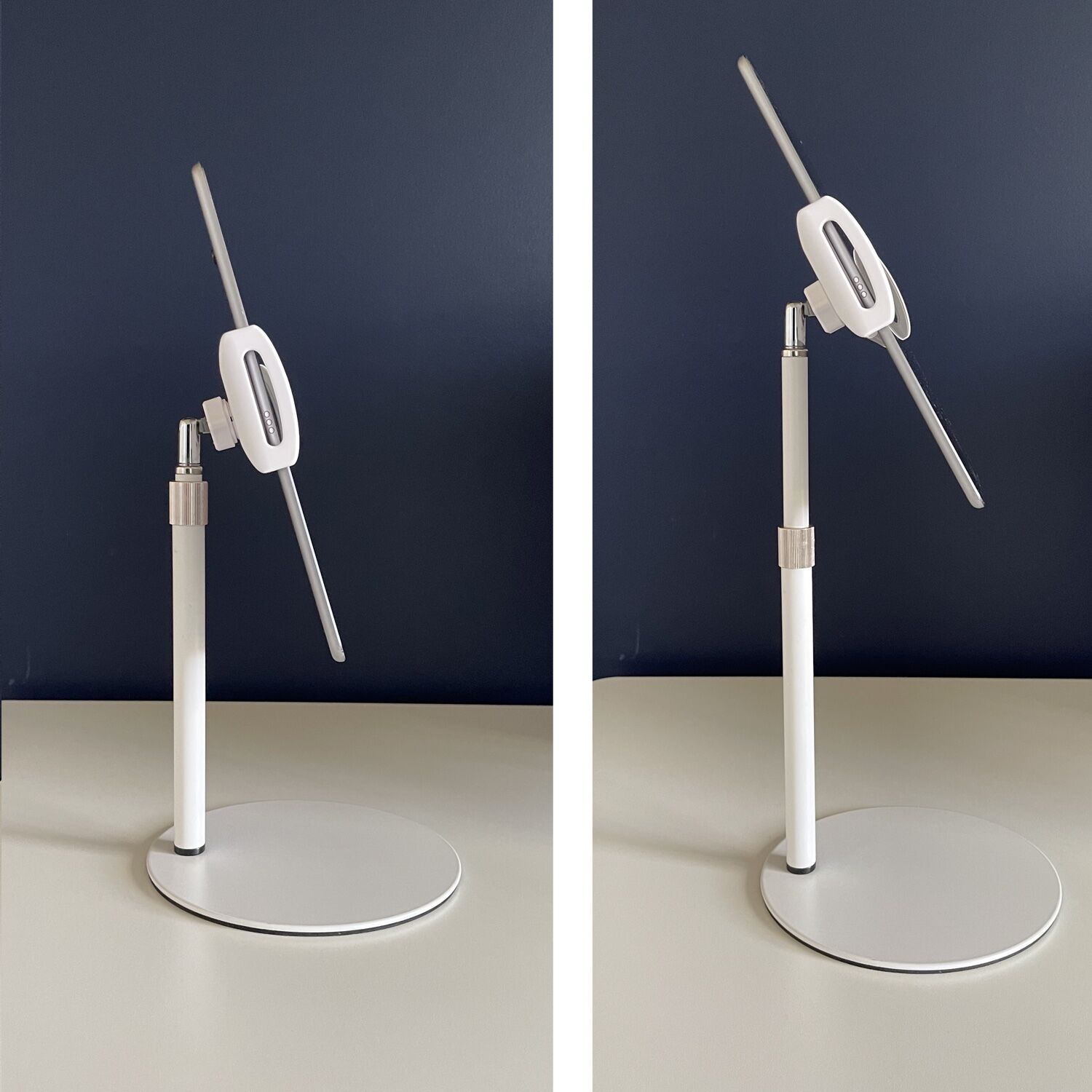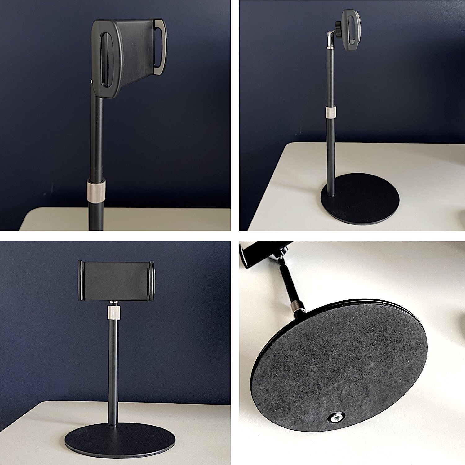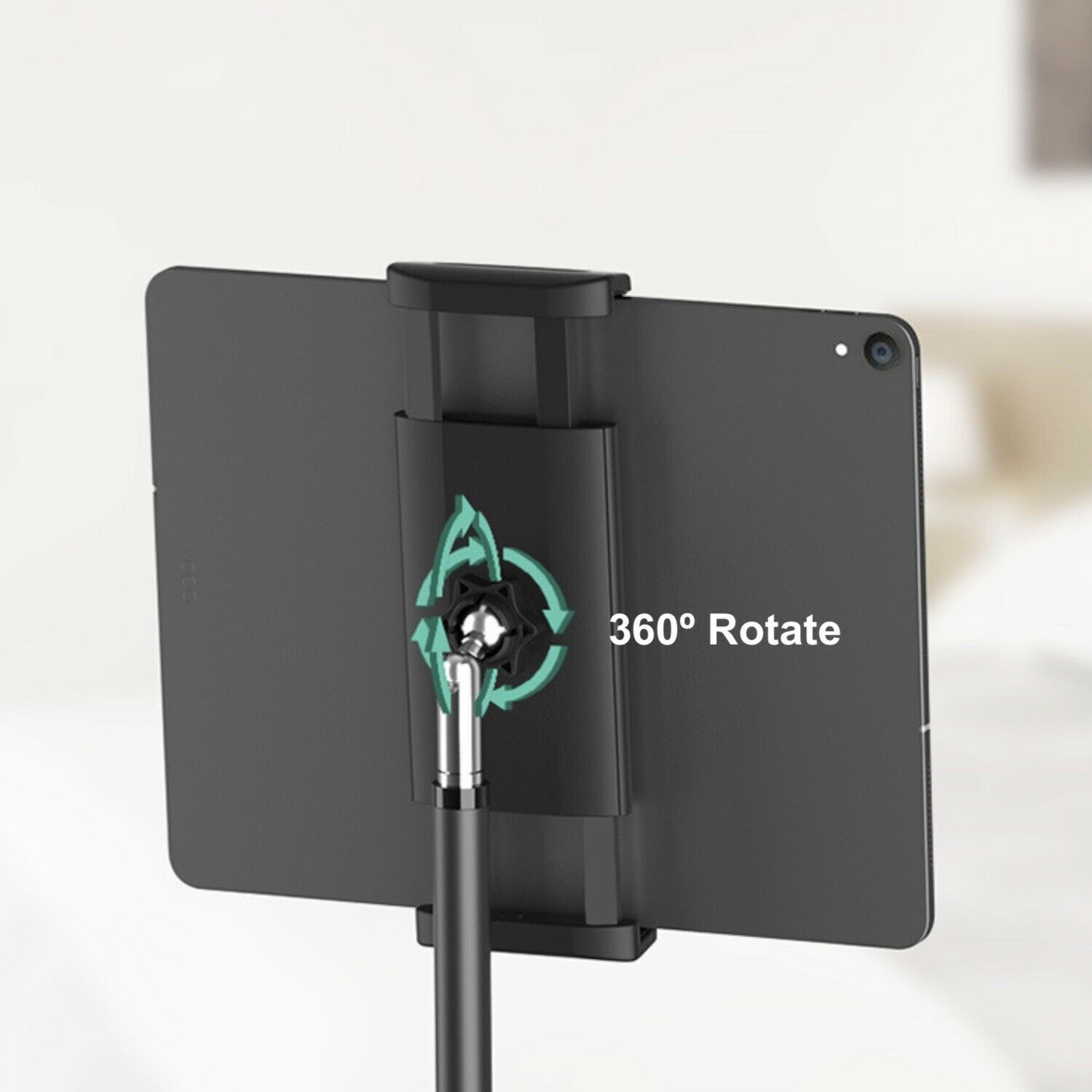 STRONG TUBE AND ANTI-SLIP: Two-stage tube made from quality steel; stable structure hold your device perfectly. In addition, protective silicon pads are attached to both ends of the powerful clamp, and you can firmly protect your smartphone or tablet from drops and scratches. A non-slip mat is used under the pedestal to effectively prevent accidental falls or wear.