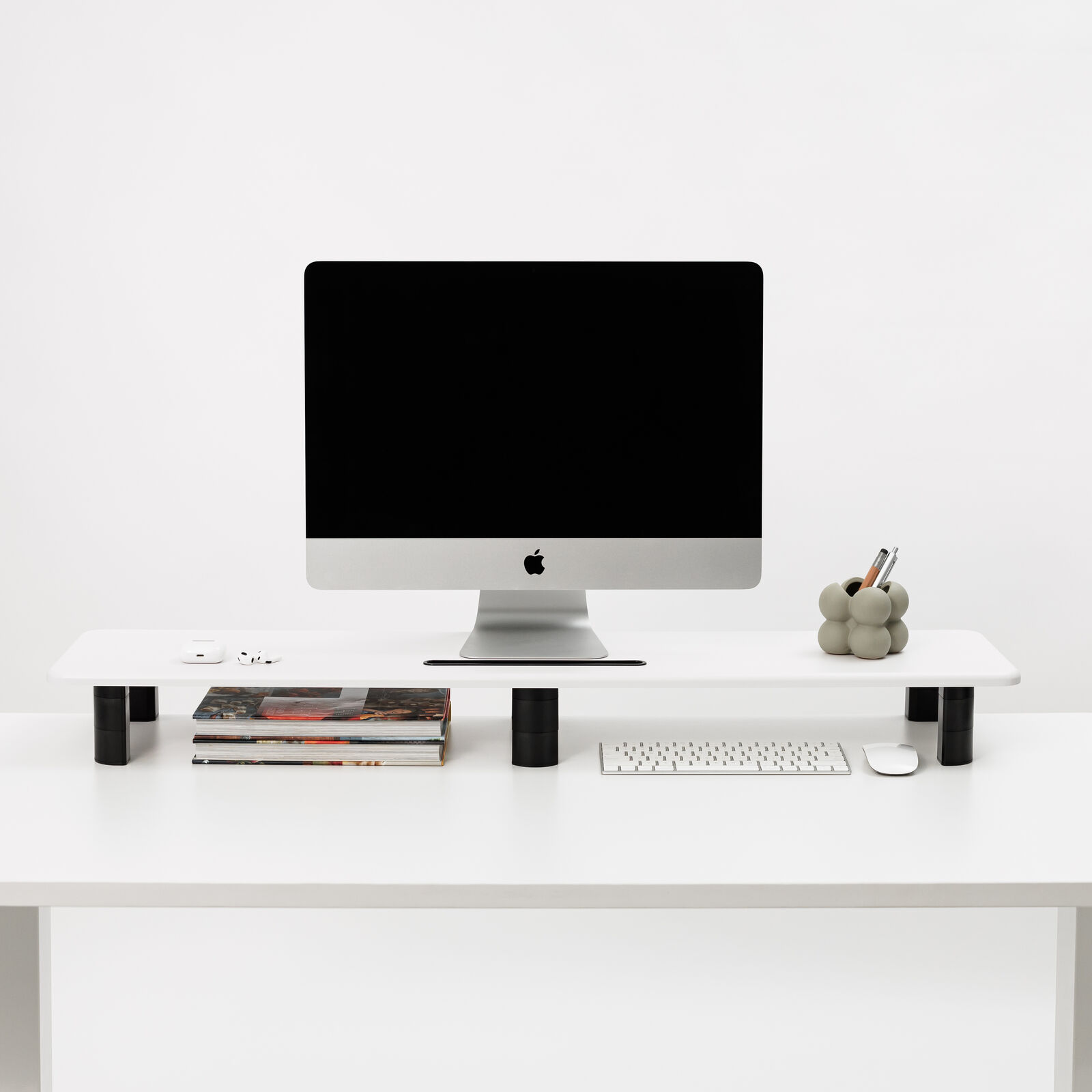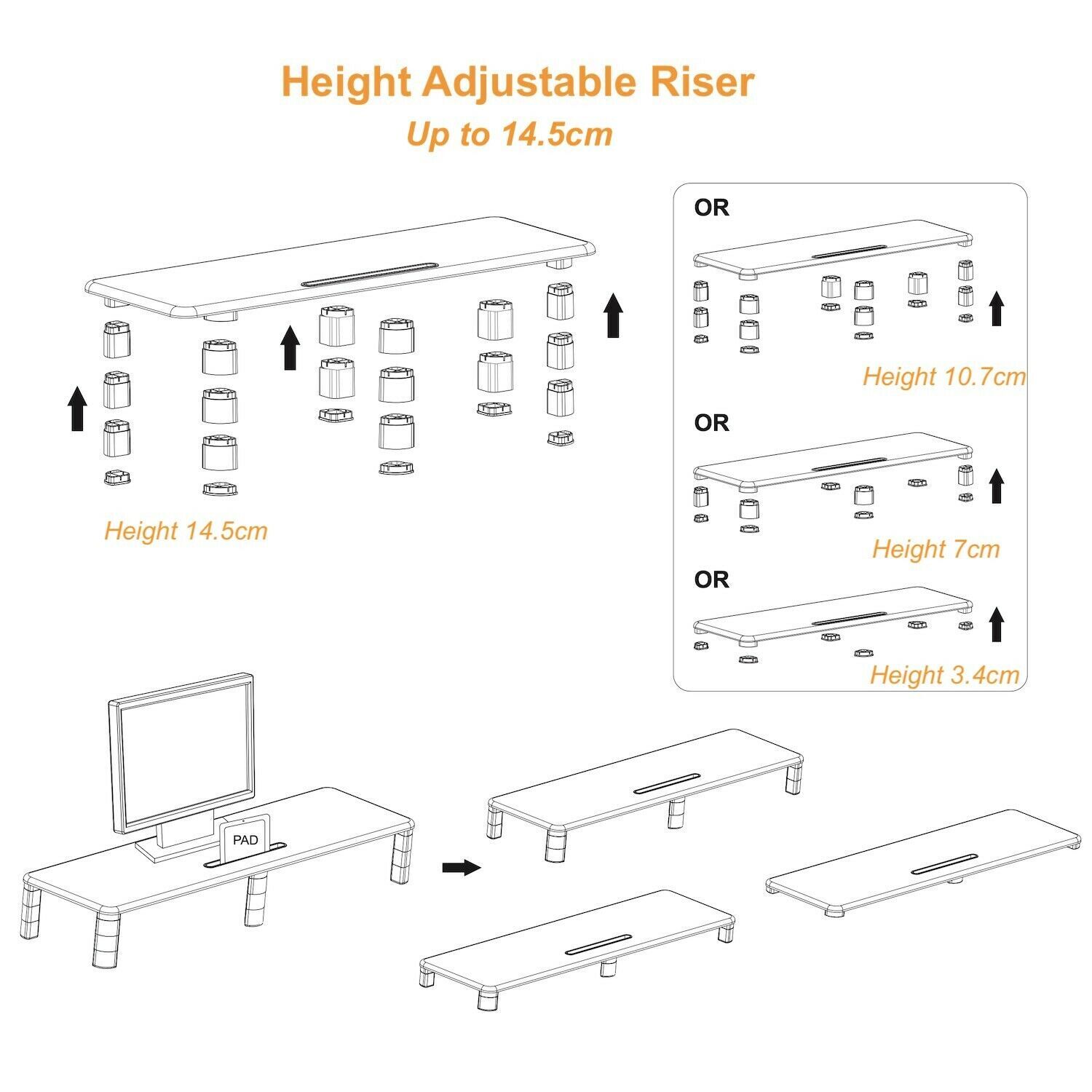 WIDE COMPATIBILITY: Height adjustable from 3.4cm to 14.5cm to place two monitors at a comfortable viewing height reducing neck and eye strain or set up with monitor arm as extra storage space.
