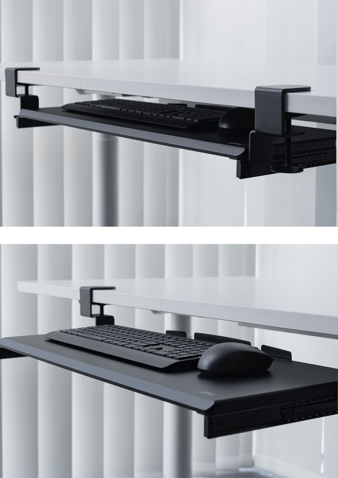 STURDY C-CLAMPS - Attach the keyboard tray to your desk without causing any damage to your desk. (Rubber protection pad provided for clamp) The C-clamps holds everything tightly in place and are easily adjustable for user convenience.