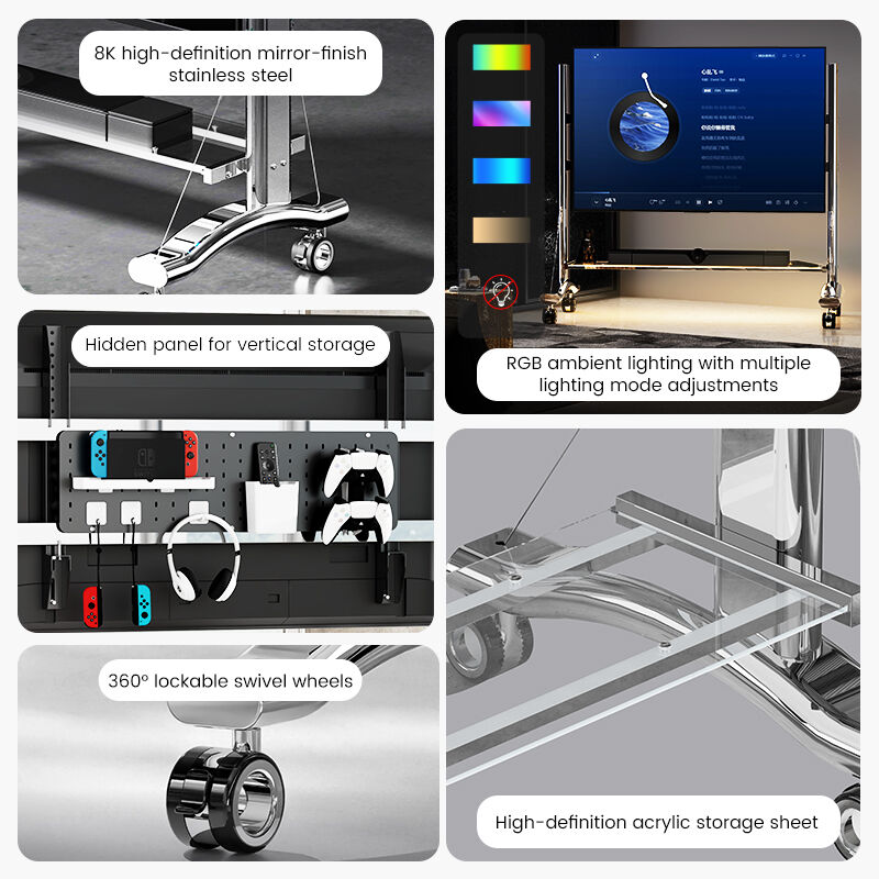 - **Big Screen Ready**: Supports large TVs with a sturdy frame built from high-strength cold-rolled steel and stainless steel. - **Smart LED Lighting**: Integrated light strip adds ambiance and a modern look to your viewing space. Led Strip controlled by remote. - **Smooth & Quiet Mobility**: Aerospace-grade silent swivel wheels with locks for easy, noise-free movement. - **Premium Build**: High-manganese, low-silicon stainless steel and aluminum construction for durability and a sleek finish. - **Reimagines Your Space**: Flexible placement lets you enjoy your screen anywhere—living room, bedroom, or open-plan areas. - ** Clear acrylic shelf for display your gadgets - **Built in metal peg board at back of tv for powerboard/cable tiding and hiding from sight