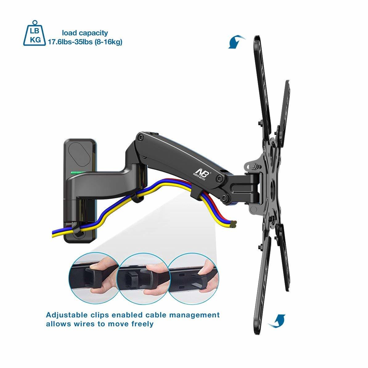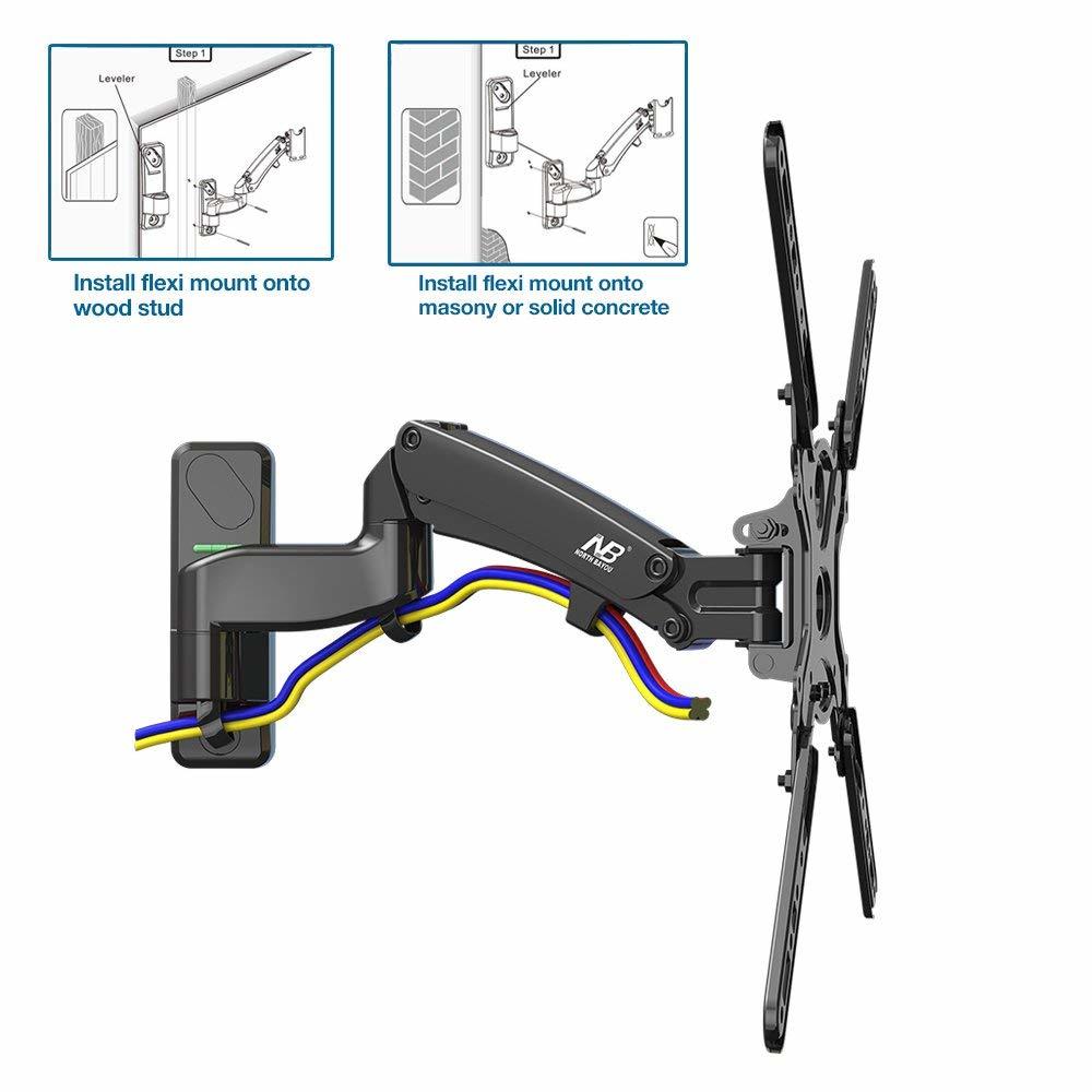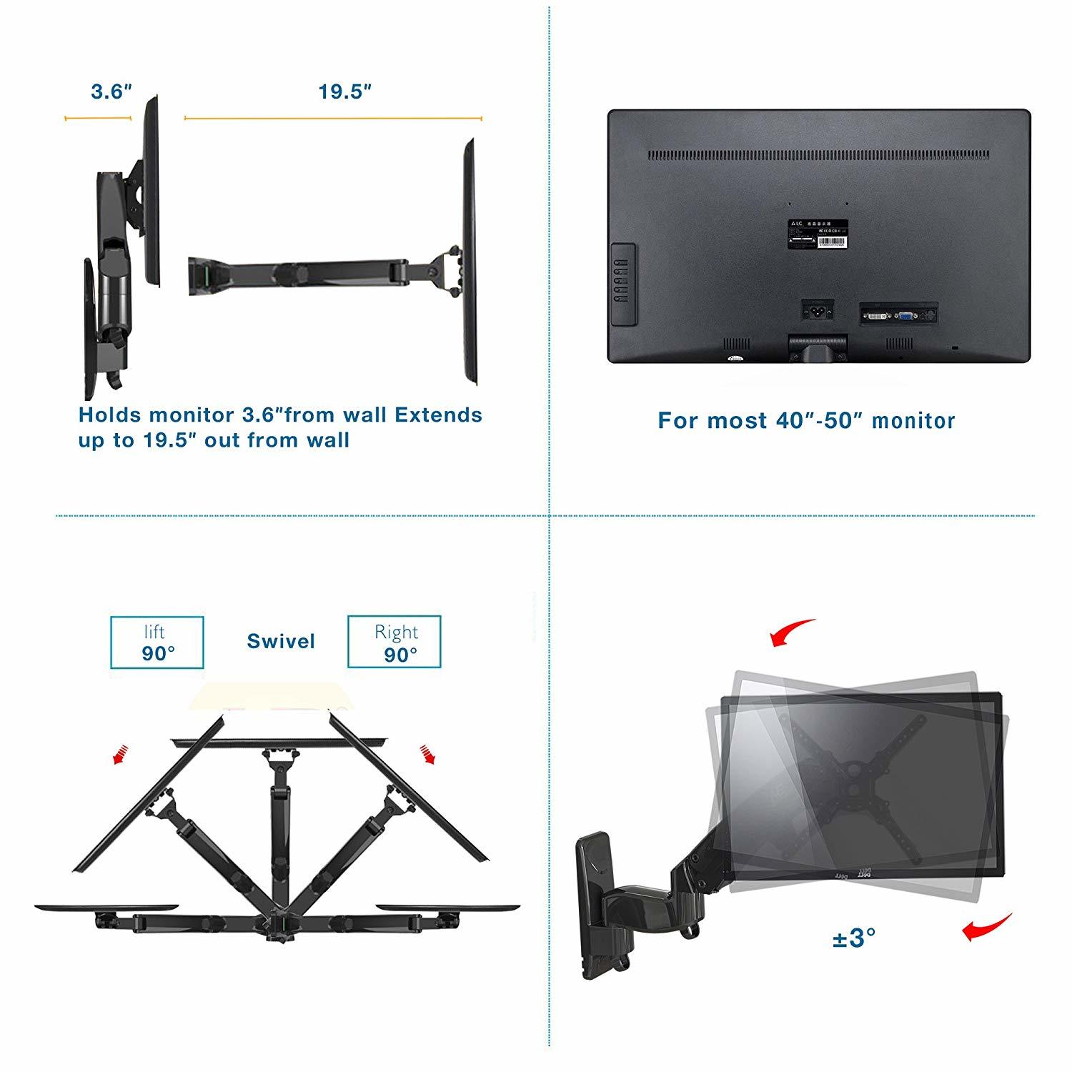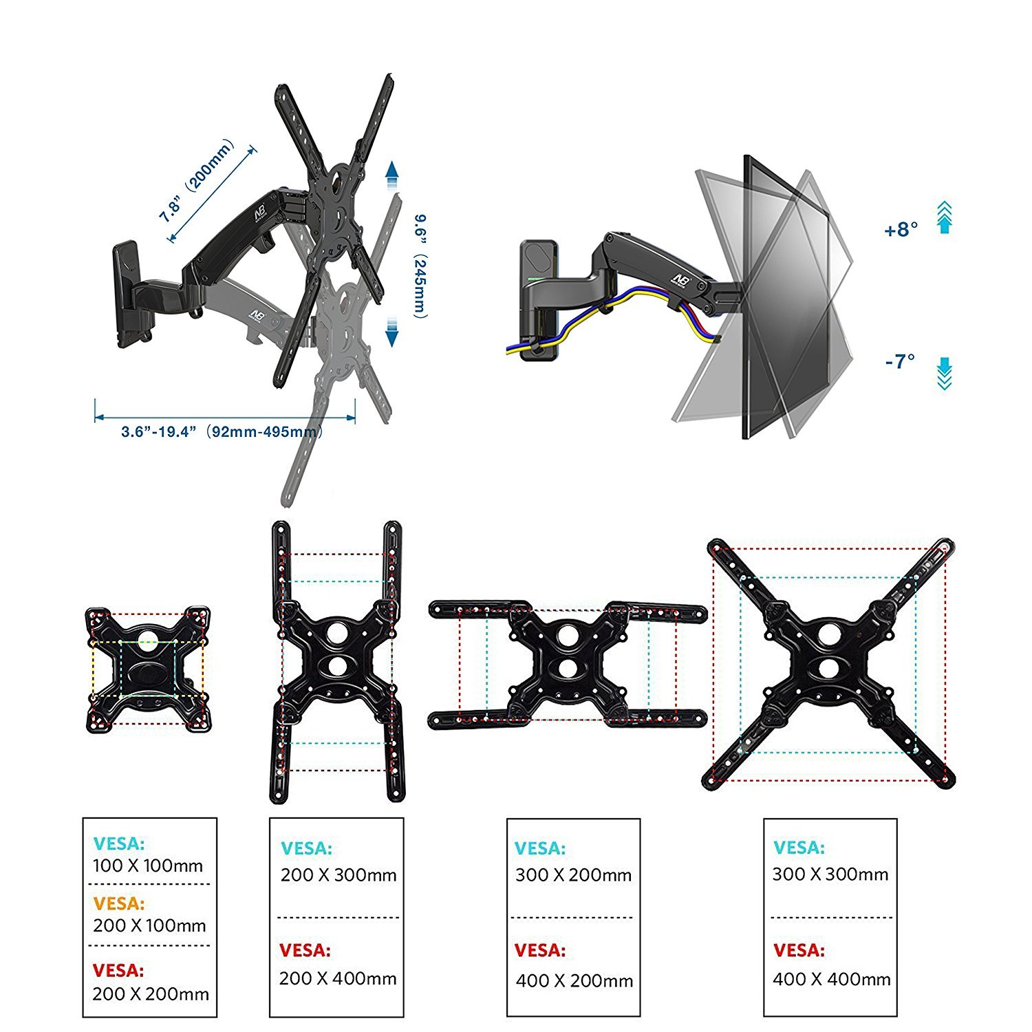 F450—Gas-Strut TV Wall Mount ■ Fits most 40”-50” LED, LCD TVs ■ Support load: 8-16kg ■ VESA compliant:100x100, 200x100, 200x200, 300x200, 300x300, 400x200, 400x300, 400x400mm(100 x 100 up to 400 x 400). ■ Upright lift distance: 245mm ■ Maximum reach from wall: 495mm ■ Rotation: +3°~-3° ■ Tilt angle: +8° to -7° ■ Polished Aluminium appearance with Painted steel VESA mount.