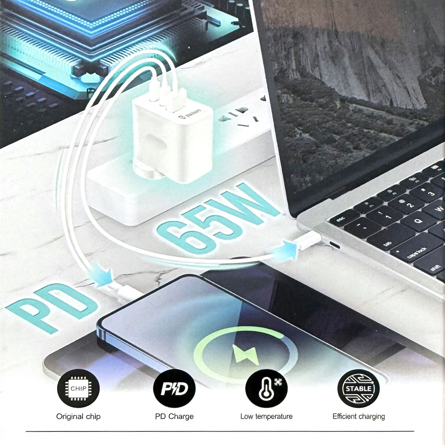 Charge multiple devices simultaneously with the MAXGuard WT03 PD Charger, a powerful 65W charger with three dedicated ports. This charger is equipped with the latest Power Delivery (PD) technology, ensuring fast and efficient charging for your devices.