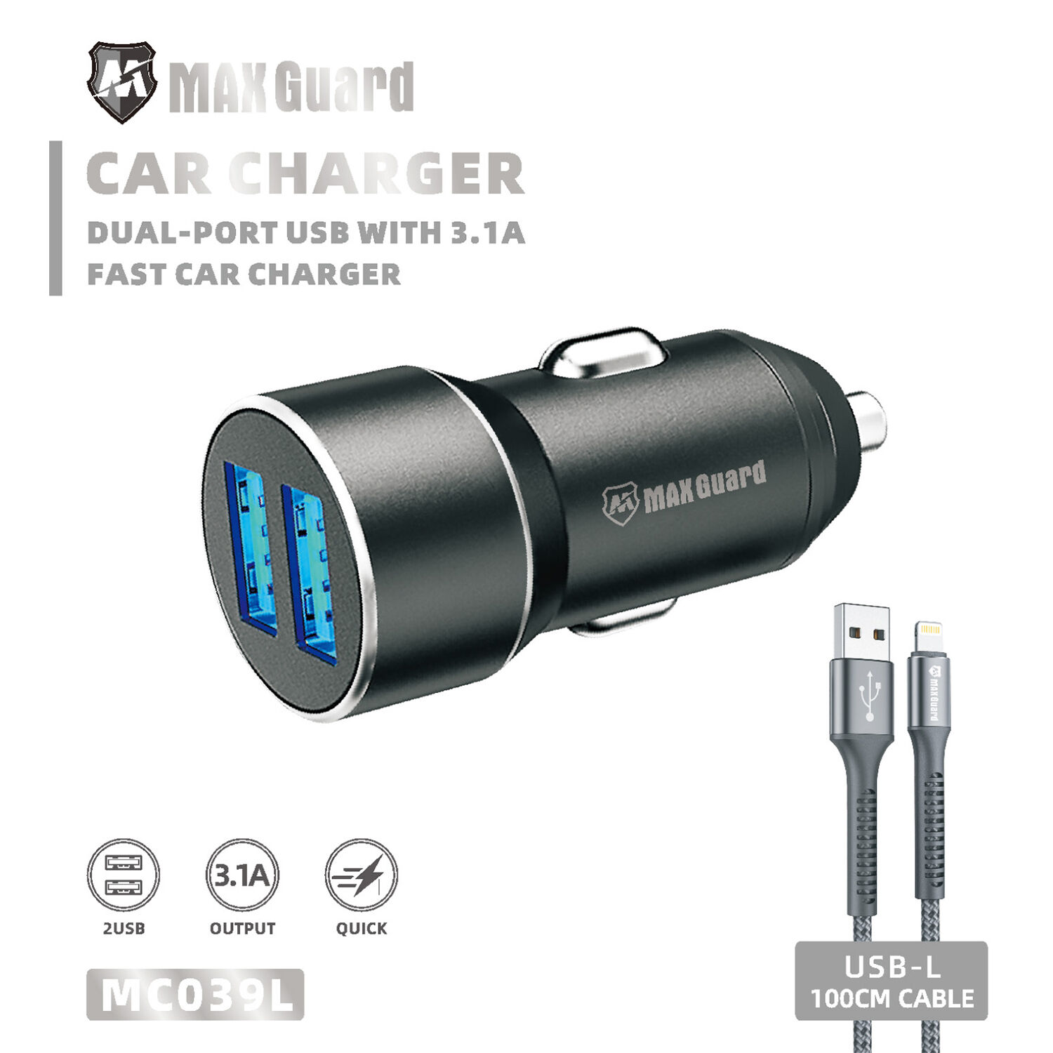 ■ Model: MC039L ■ Color: Black ■ Texture: Metal ■ Input: DC 12-24V ■ Output: USB1/2: DC5V-3.1A ■ Certifications: CE, FCC, RoHS