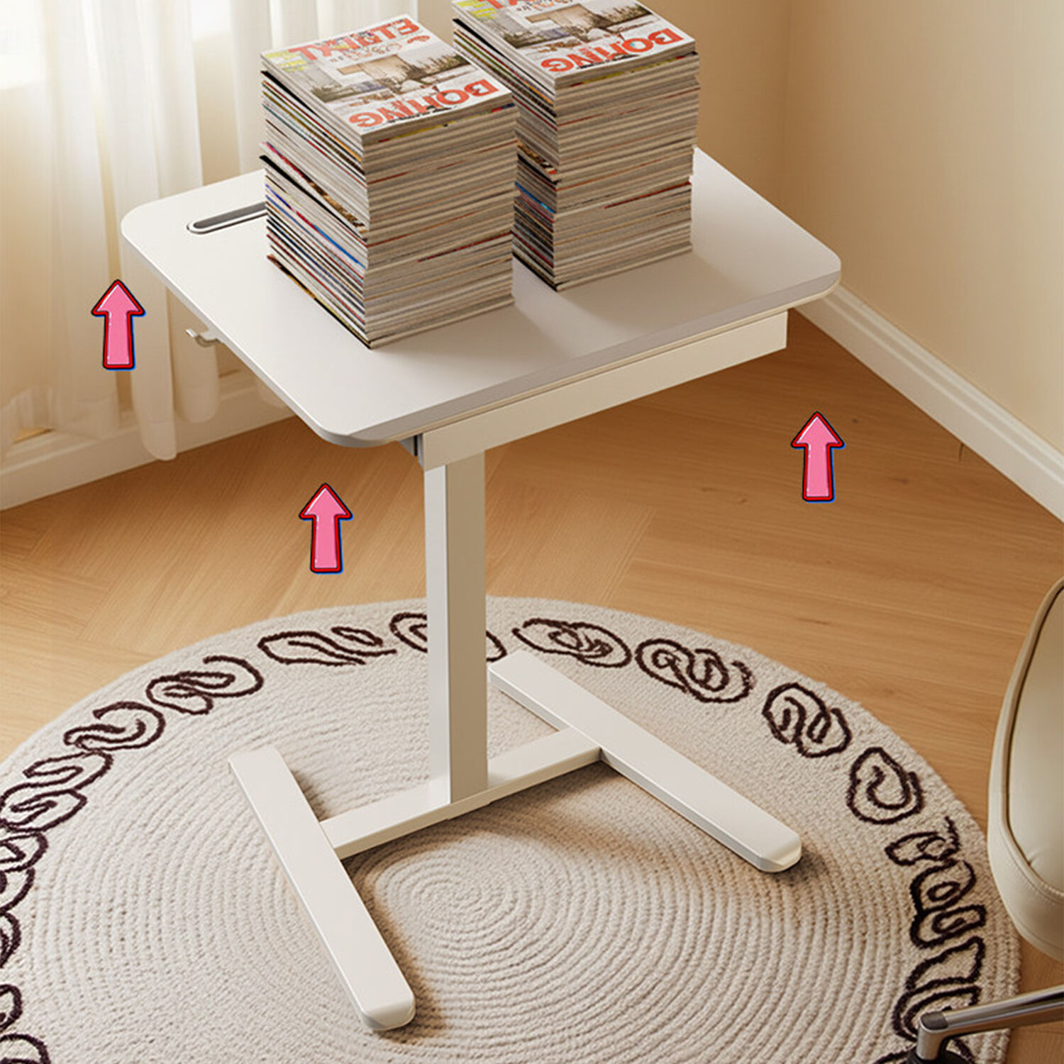 The universal wheels makes it very easy to move the desk around, with high mobile flexibility to use this rolling table as a workstation or computer desk anywhere.