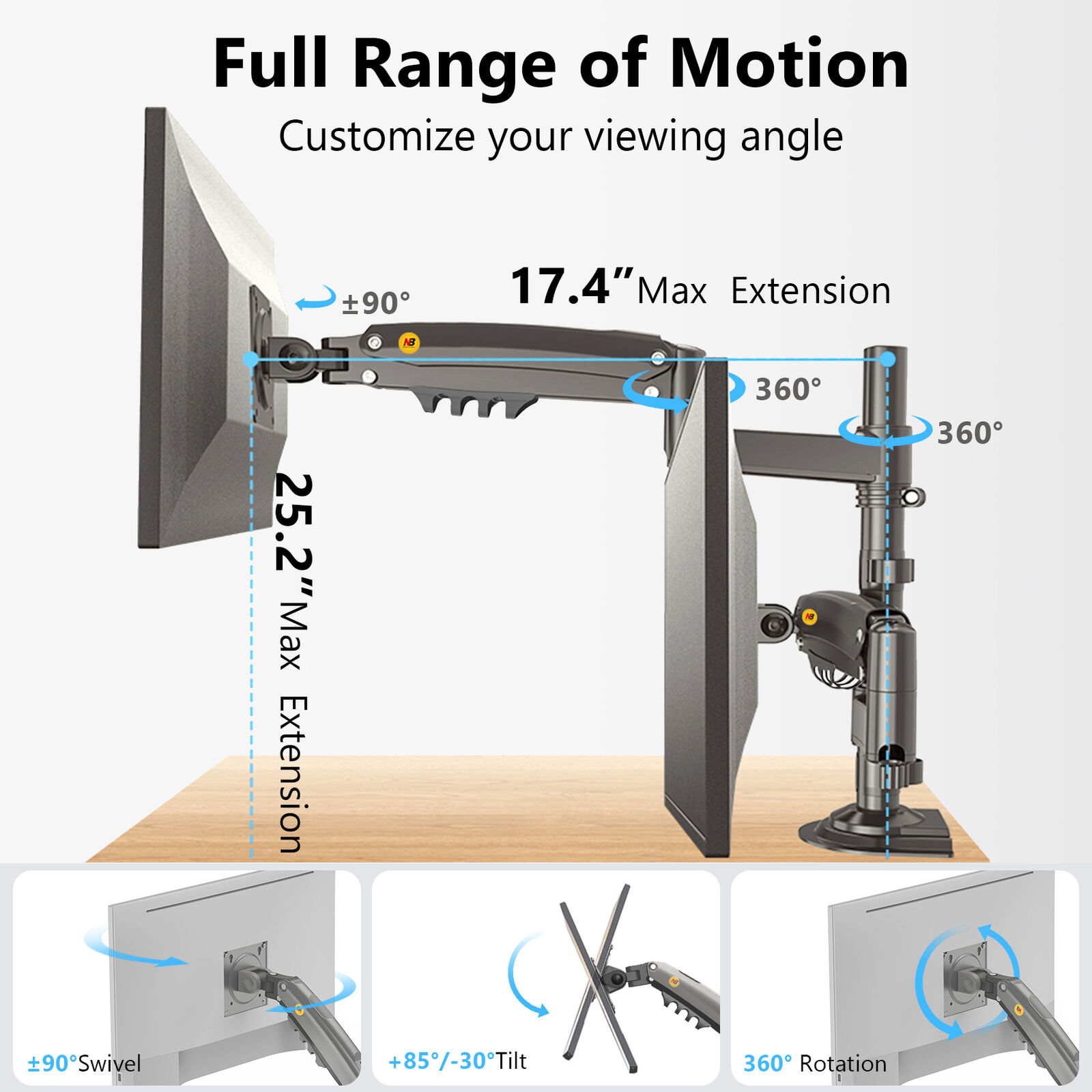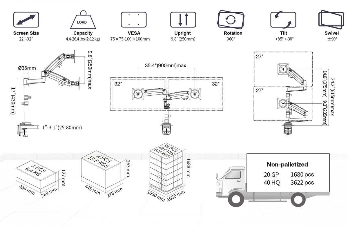 ■ Supports loads from 2 kg to 9 kg per arm. ■ VESA compliant 75 x 75, 100 x 100 mm ■ Upright lifting distance 250 mm ■ Maximum height to center of VESA mount 615 mm ■ Swivel 360° Swivel ±90° ■ Tilt +85° to -30° ■ Maximum outreach 615 mm ■ Colour: Bronze Grey