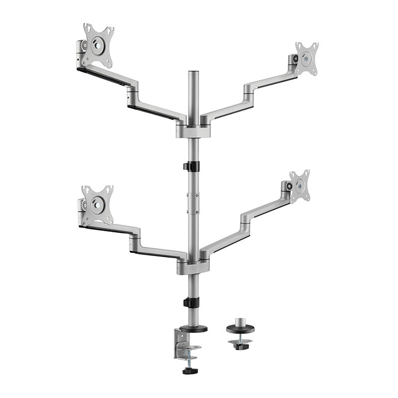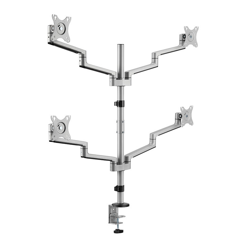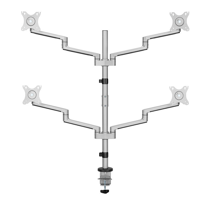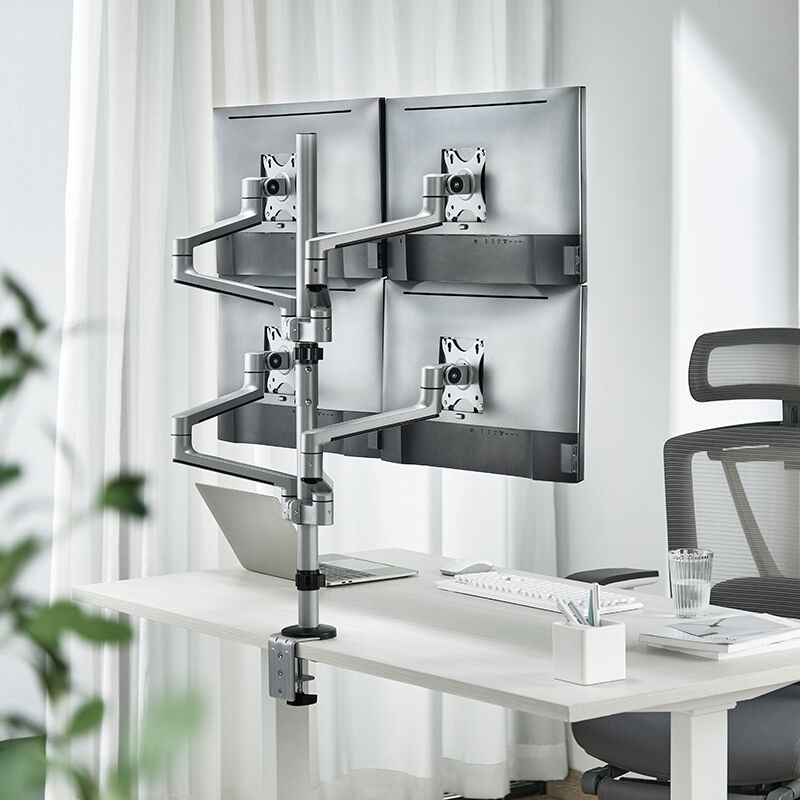 Key Features: Quad monitors Premium build – Aluminum construction. Ergonomic flexibility – Wide range of motion (tilt, swivel, rotation). Multi-configuration support – Single, dual, quad, and laptop-compatible models. Clean cable management and easy installation Versatile mounting – Clamp, grommet