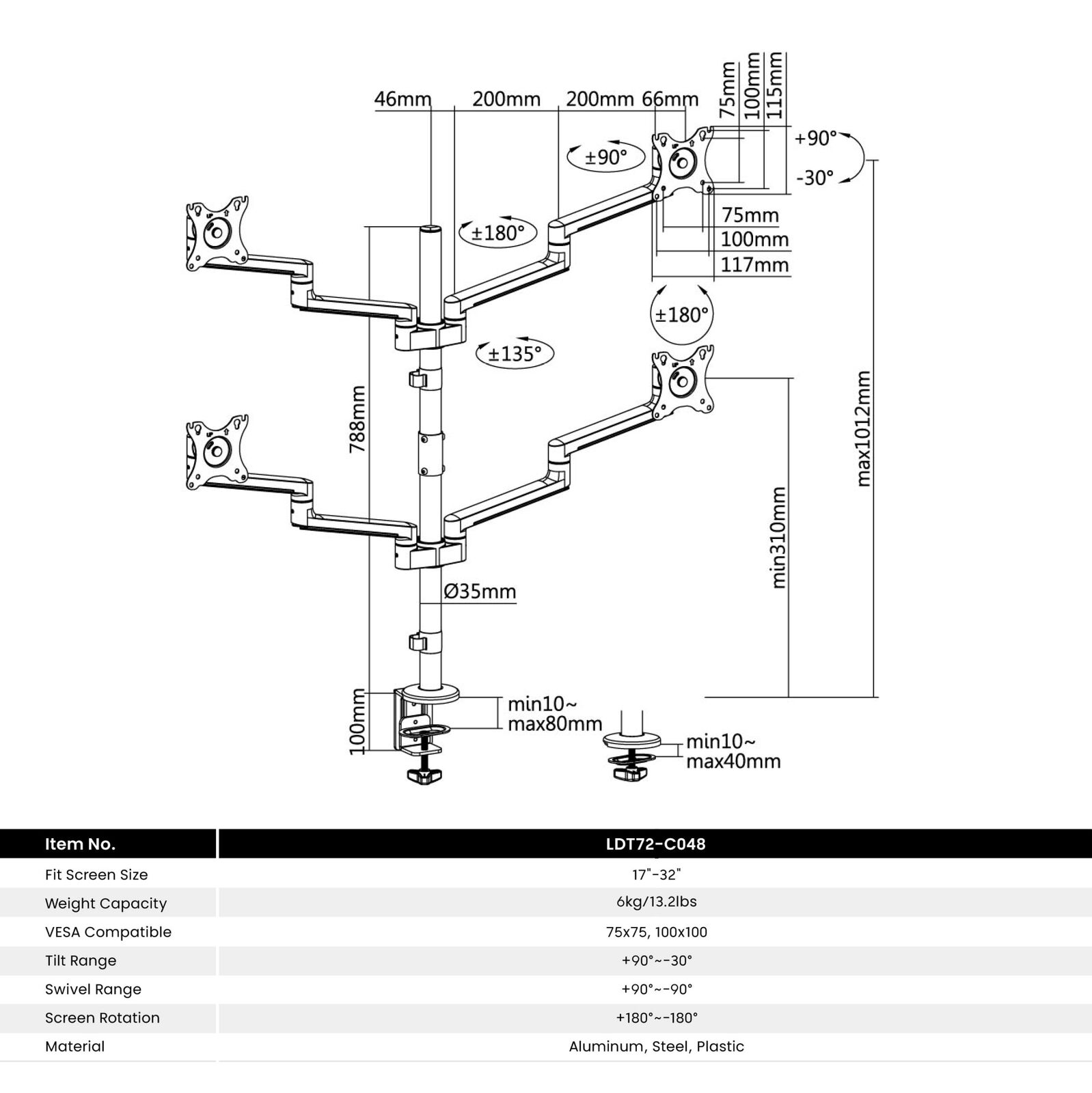 Quad monitors Premium build – Aluminum construction. Ergonomic flexibility – Wide range of motion (tilt, swivel, rotation). Multi-configuration support – Single, dual, quad, and laptop-compatible models. Clean cable management and easy installation Versatile mounting – Clamp, grommet