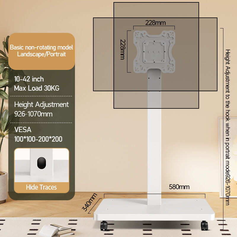 Plate:228*228mm Base:340mmx580mm Height adjustment to the Plate:926 and 1070mm Swivel angle:±30° Tilting: -7°~+10° 360° rotation VESA:100*100 - 200*200mm Load capacity:30kg Compatible Size:10 - 42inches