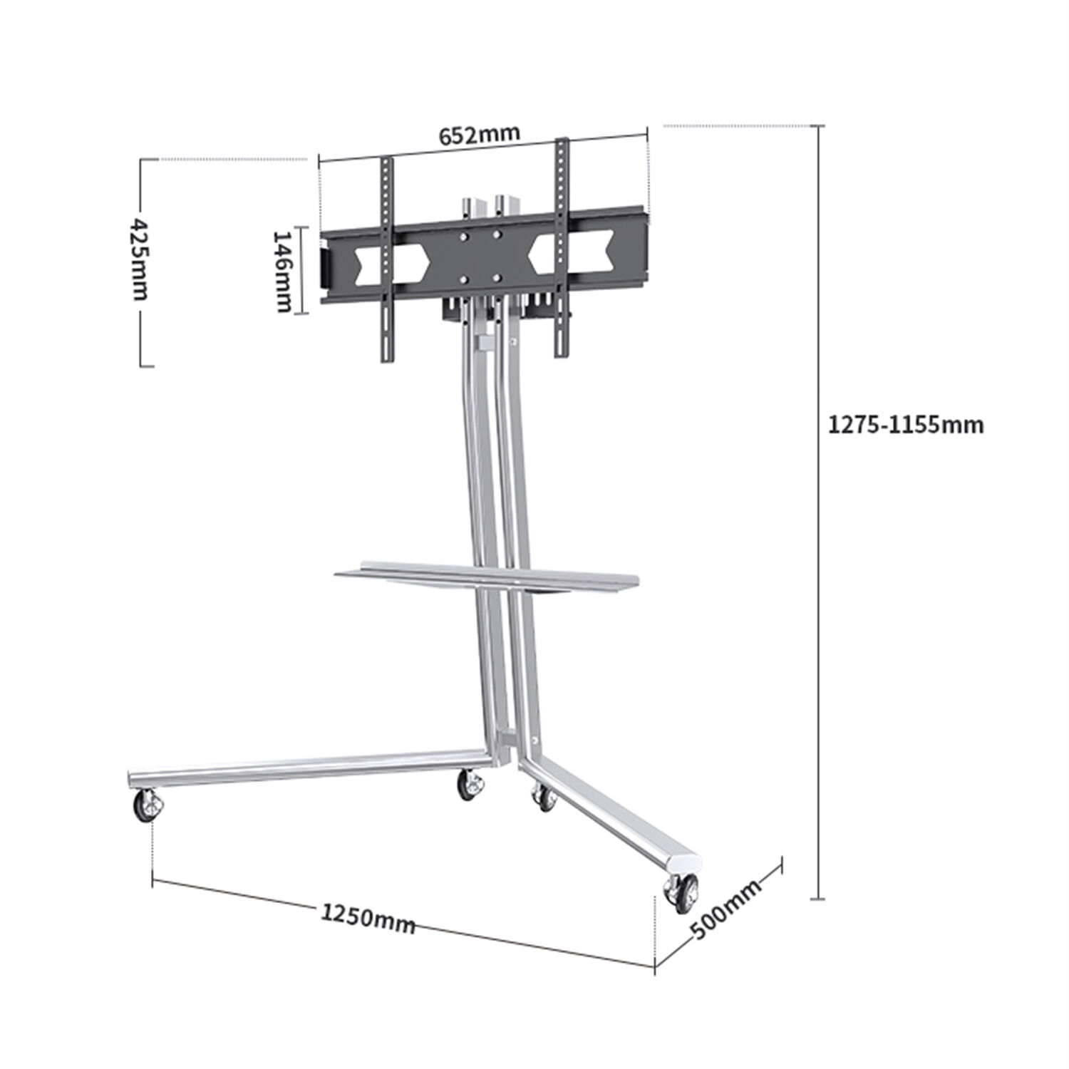 Plate:652*146mm Bracket:425*30mm Height adjustment to the Hook top:1155-1275mm AV Shelf:600*115mm Base Size:1250*500mm Shelf size:80*60*250mm VESA:100*100 - 600*400mm Load capacity:40kg Compatible Size:32 - 65 inches