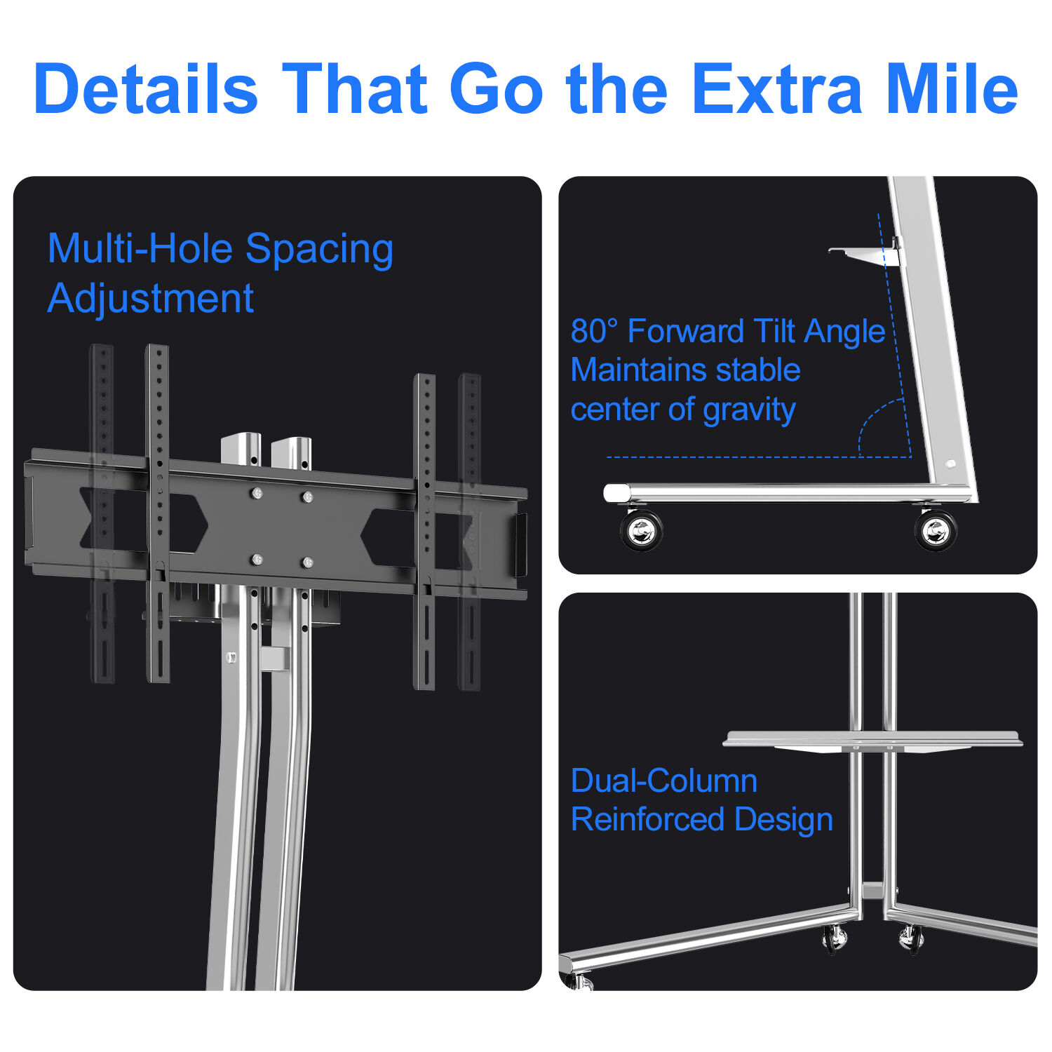 Smooth Mobility and Intelligent Design: Glide your entertainment setup effortlessly across your home on quiet universal casters. These wheels feature a PVC contact surface that protects your floors from scratches, and durable zinc alloy chrome plating for long-lasting performance. The stand includes practical storage solutions with a rear tray and a middle shelf, perfect for organizing media devices, and offers height adjustment (1155-1275mm) for optimal viewing.