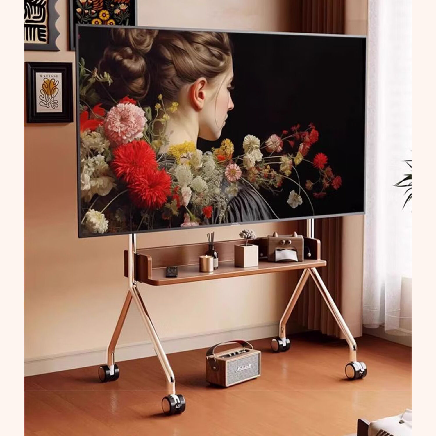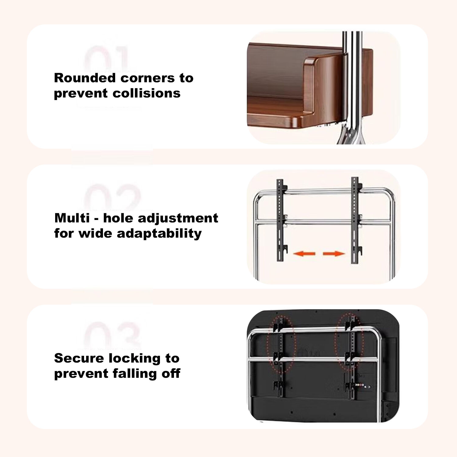 Engineered for Strength and Stability: The stainless steel frame is engineered with a triangular mechanical design and features a reinforced 22mm thick main column that distributes weight evenly, confidently supporting up to 50kg. This makes it effortlessly capable of carrying most large-screen TVs. The universal brake casters allow for smooth, easy movement and secure locking in any desired position.