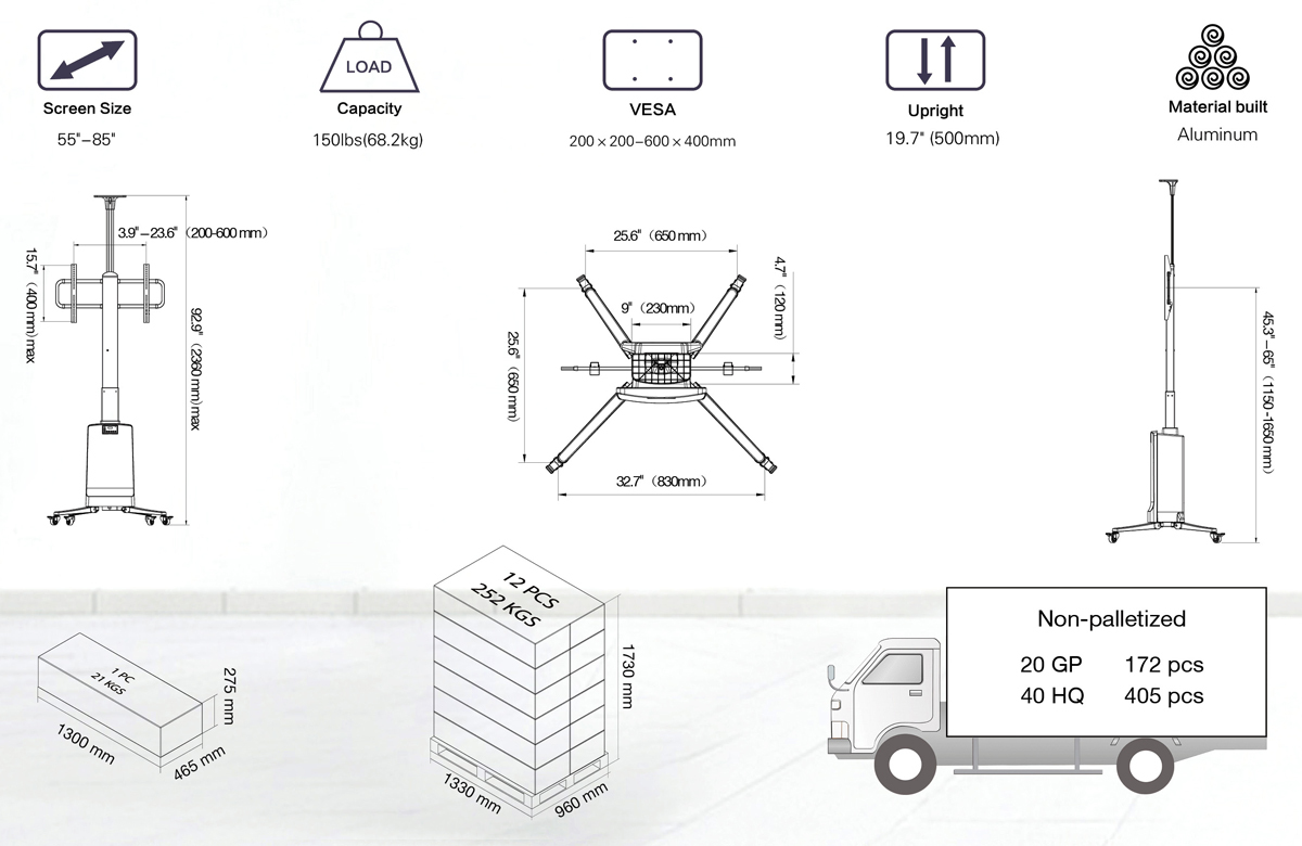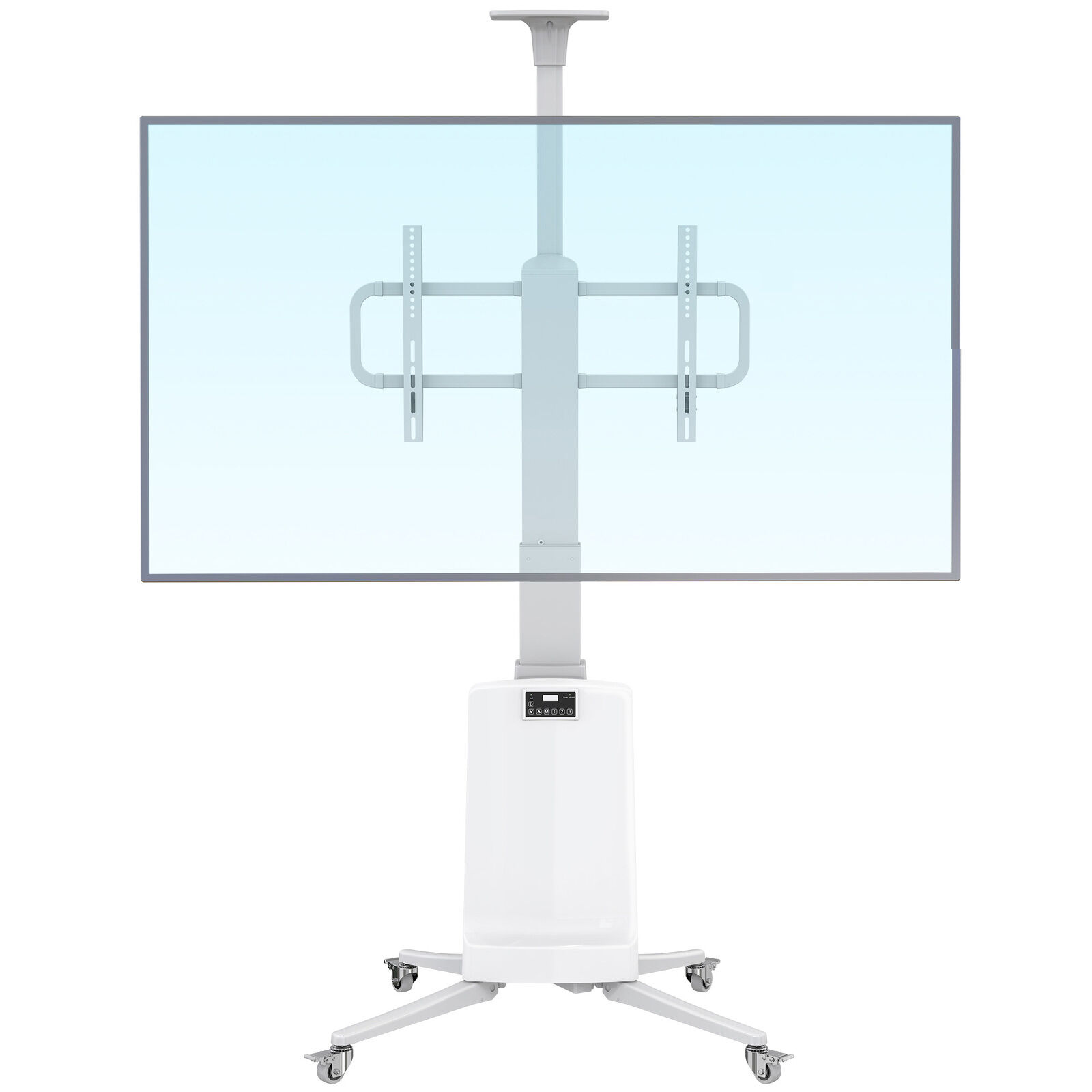 * Motorised height adjustment. * Smooth rolling braked castors for effortless positioning (4 braked casters) * High tensile strength steel and rigid aluminium alloy materials. * Integrated cable management through columns. * Carry maximum load 68.2kgs and up to 85” flat panel TV * VESA compliance:200x200,300x200,300x300,400x200,400x300,400x400,500x300,500x400,600x400 (200x200mm up to 600x400mm). Fits most large screens in current market. * Flexible and installer-friendly. Easy and convenient. * Perfect space saver.